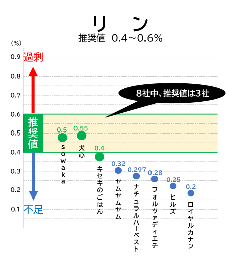 - リンは0.5%以上とAAFCO基準最低値近くまで制限。【参考】AAFCO基準最低値:リン0.4%
